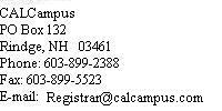 SAVE THIS FORM TO YOUR COMPUTER FIRST. Then, fill it out and e-mail/fax/surface mail to:Student's Name_________________________________ Date_____________________ Mailing Address________________________________________________________ ________________________________________________________ ________________________________________________________ Internet E-mail_____________________________ Phone_____________________ Date of Birth_________________________________ ====================================================================== STUDENT ACKNOWLEDGMENT All students are required to read the program description and download the Student Manual posted in our online catalog before registering for a course or program. Please confirm that you have received this information. Check below: ____ I have read this registration form, the relevant description posted online, and have downloaded the Student Manual. Signature of Student ___________________________________________ (Handwritten signature is required of New Hampshire residents. Scanned/fax/surface mail) =================================================================== SELECT YOUR PAYMENT PLAN: (3-06) Check ONE 1. TUITION DISCOUNT___ 2. PAY PER 2 COURSES___ 1. TUITION DISCOUNT on Course Fees Discount on four course fees in the program paid at time of application. Renewed after 6 months for another 4 courses ($990), until student completes 20 courses required for diploma. 4 Course Registration Fees + CALCampus Student Admission Fee ($50) + Business Administration Professional Diploma Application Fee ($50) TOTAL__$1,090___ 2. PAY PER TWO COURSES: See Course List with Prices of Individual Courses CALCampus STUDENT ADMISSION FEE ($50) (new students only: non-refundable after 3 days) + Business Administration Professional Diploma APPLICATION FEE ($50) + COURSE #1 REGISTRATION FEE ($______) Course #1 Title____________________________________ Course #1 Number_______________________ + COURSE #2 REGISTRATION FEE ($______) Course #2 Title____________________________________ Course #2 Number_______________________ TOTAL ($100 PLUS TWO COURSE REGISTRATION FEES) $___________________ ===================================================================== PAYMENT METHOD (Select one.) Amounts in U.S. funds. Check/Money Order _____ Payable to CALC. See instructions below. Credit Card Check one. Credit cards are billed by Computer Assisted Learning Center (CALC) VISA___ MasterCard___ Discover___ American Express___ Card #___________________________________________ Exp.Date_________ Name of Card Owner ________________________________________________ Billing Address of Card Owner______________________________________ Signature of Card Owner___________________________________________ All monies paid by the student will be refunded if requested within three (3) days after you submit the application form. ===================================================================== ACCOMPANYING DOCUMENTATION __ High School Transcript or Official GED report __ Copy of Personal Identification (ex. driver's license; passport; international ID) __ 300-word admissions essay discussing your educational and professional goals